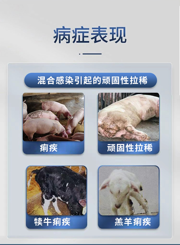 產品簡介:針對混合感染引起的頑固性拉稀,效果迅速,高效安全!