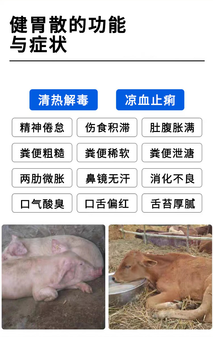 【主治】傷食積滯,消化不良。癥見(jiàn)精神倦怠,水草減少或廢絕,肚腹脹滿,糞便粗糙或稀軟,完谷不化,口氣酸臭,口色偏紅,舌苔厚膩,脈象洪大有力。牛反芻停止,兩肋微脹,嚴(yán)重時(shí)鼻鏡無(wú)汗,大便瀉溏、惡臭。