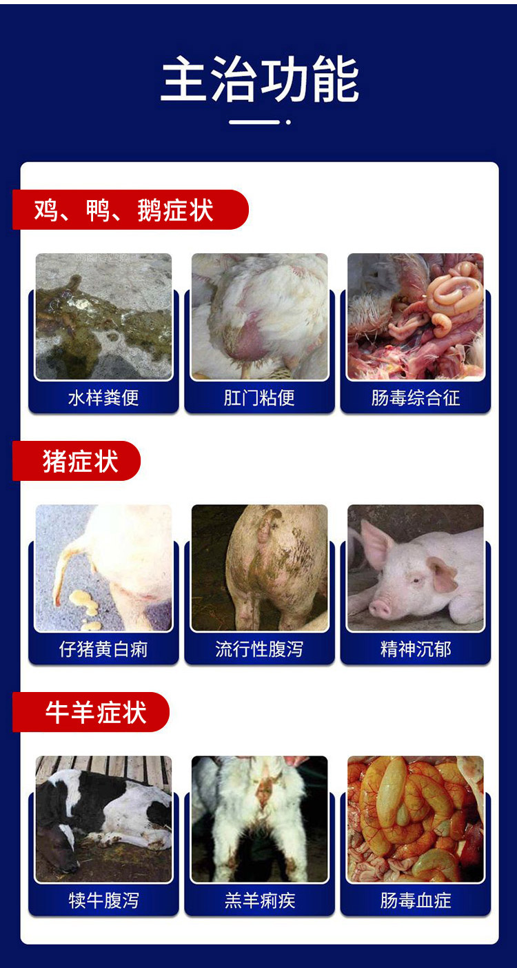1.防治仔畜黃痢、白痢、水腫病、傳染性胃腸炎、流行性腹瀉、斷奶仔畜應(yīng)激性腹瀉等引起的不吃不動(dòng)、被毛粗亂、腹脹、痢疾、拉黃、白、綠色水樣便等以及犢牛、羔羊不明原因腹瀉。