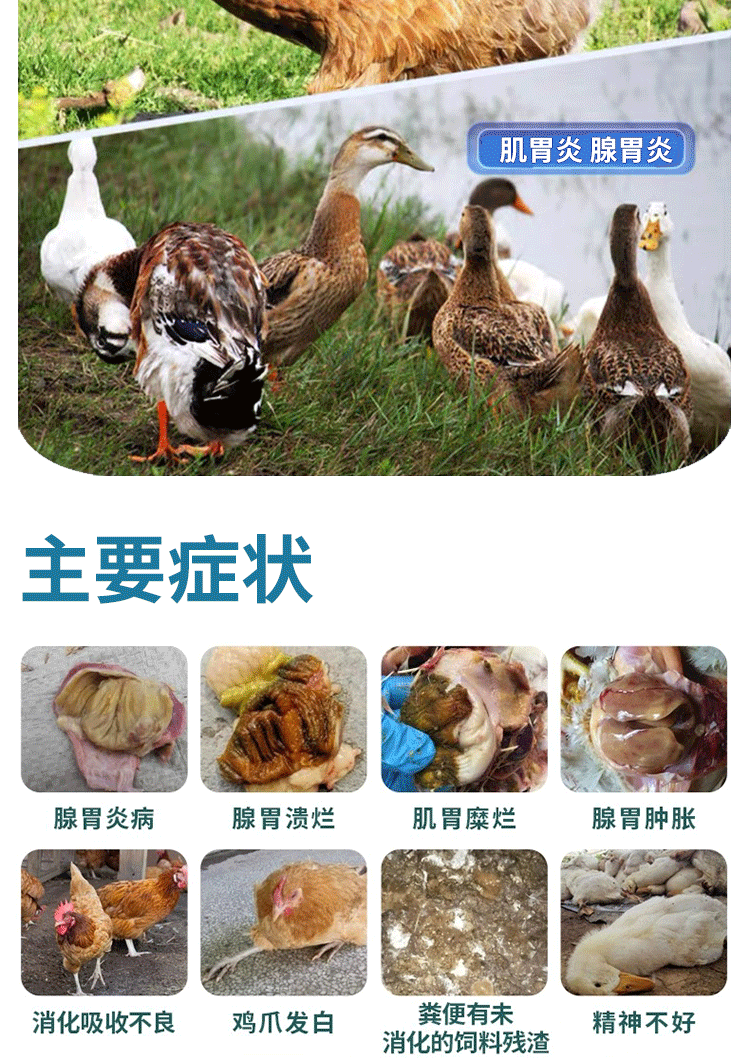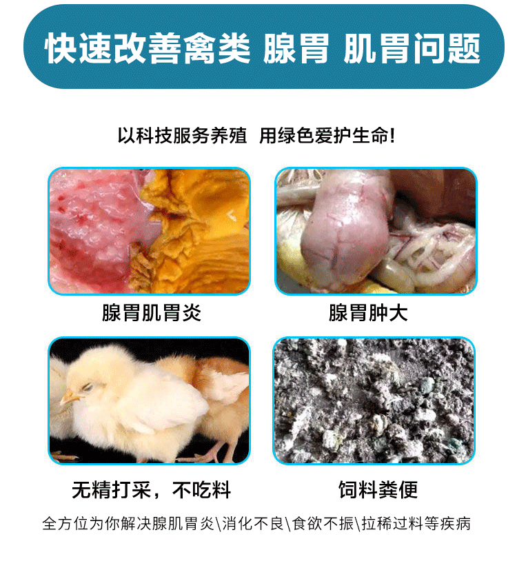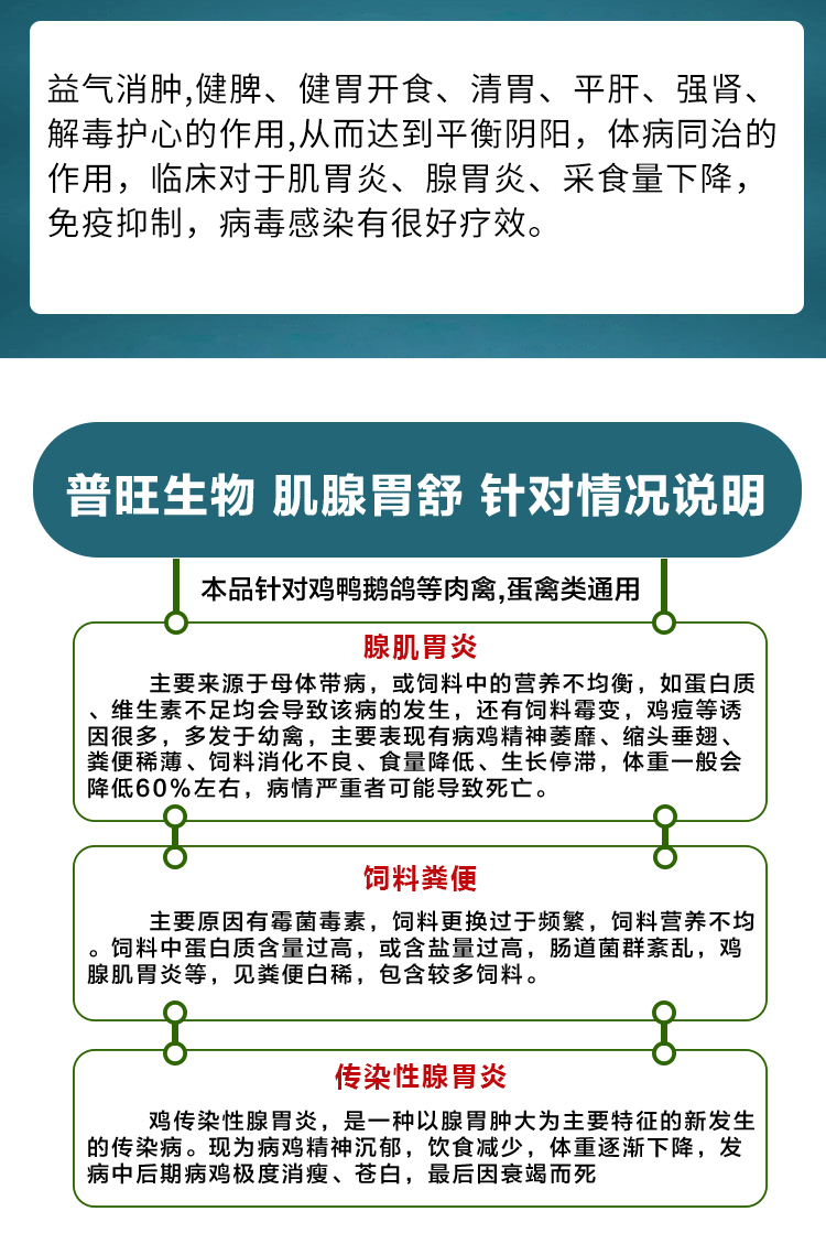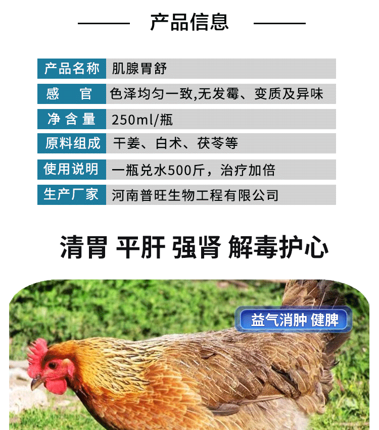 【適用范圍】益氣消腫,健脾、健胃開食、清胃、平肝、強(qiáng)腎、解毒護(hù)心的作用,從而達(dá)到平衡陰陽,體病同治的作用,臨床對于肌胃炎、腺胃炎、采食量下降,免疫抑制,病毒感染有很好療效。