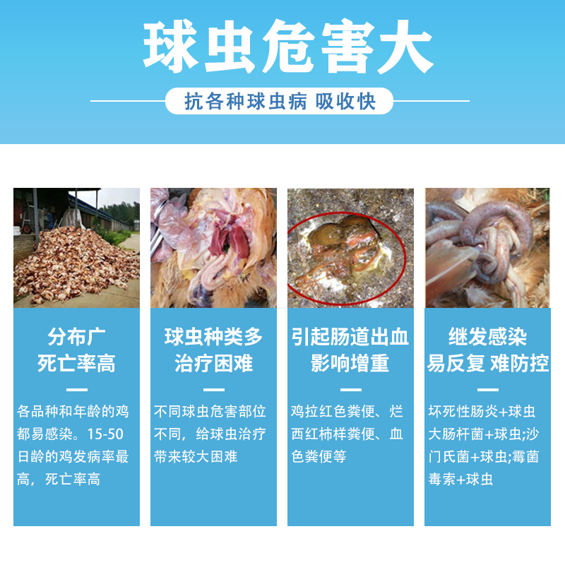 【藥理作用】本品為磺胺類抗球蟲藥,作用峰期是球蟲第二代裂殖體,對第一代裂殖體也有一定作用。本品抗菌作用較強,對禽巴氏桿菌病、傷寒亦有效。本品不影響宿主對球蟲產生免疫力。