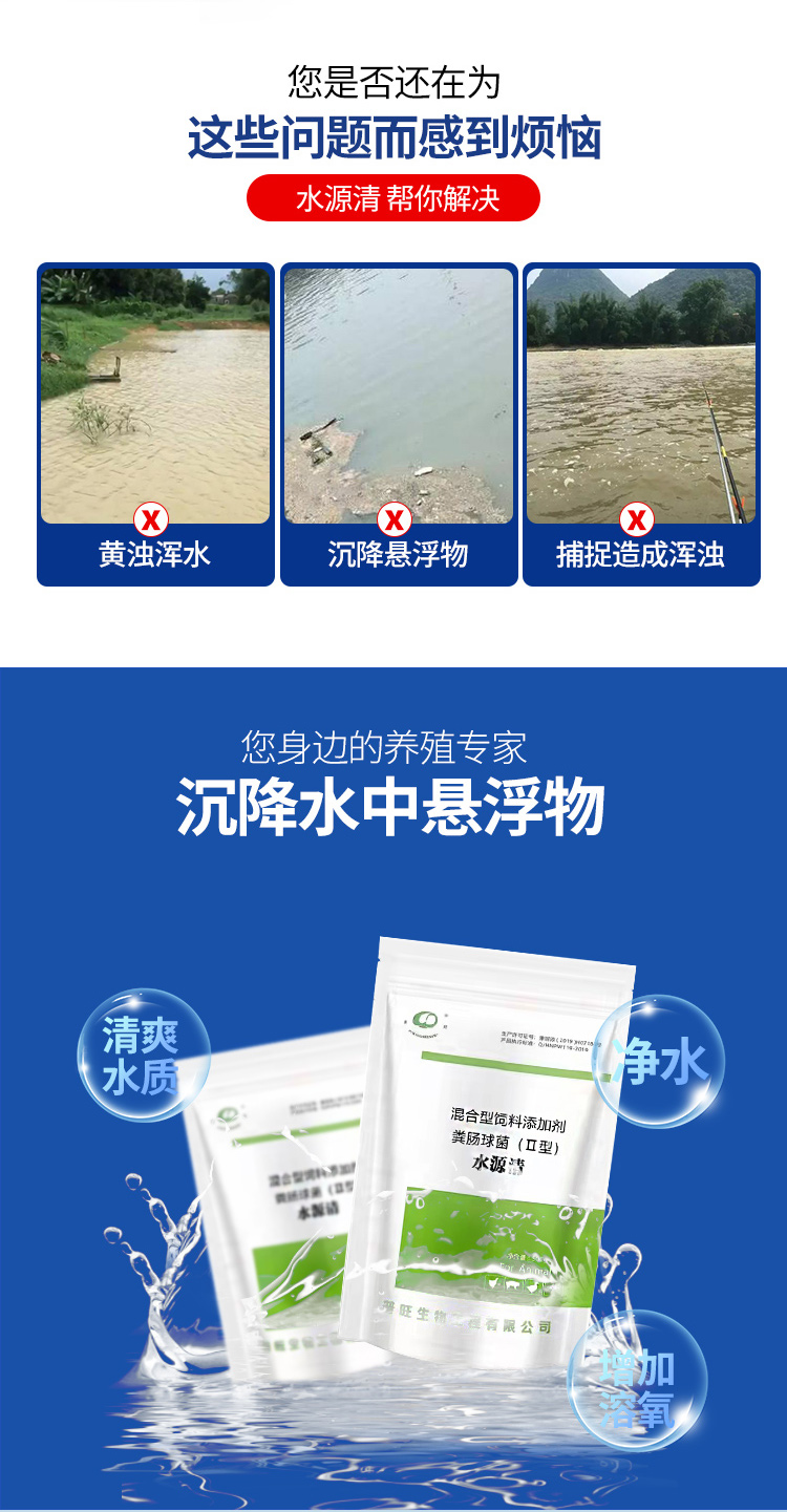 產品簡介:水源清 清爽水質 增加溶氧 沉降水中懸浮物 水產常備