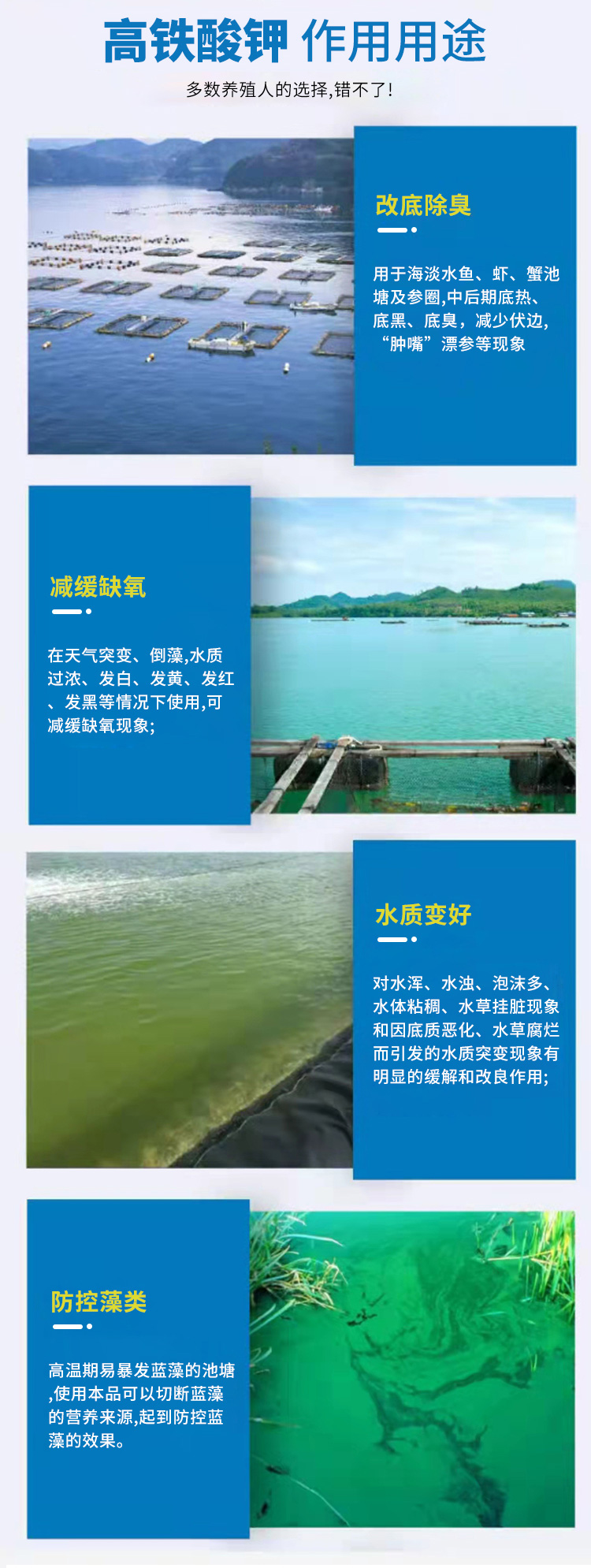 輕松養(yǎng)殖,助力水產(chǎn)。增加水體的溶氧量對水體中氨氮、亞硝酸鹽水藻類具有良好的去除效果凈化水質(zhì)殺菌改底祛除異味。" />