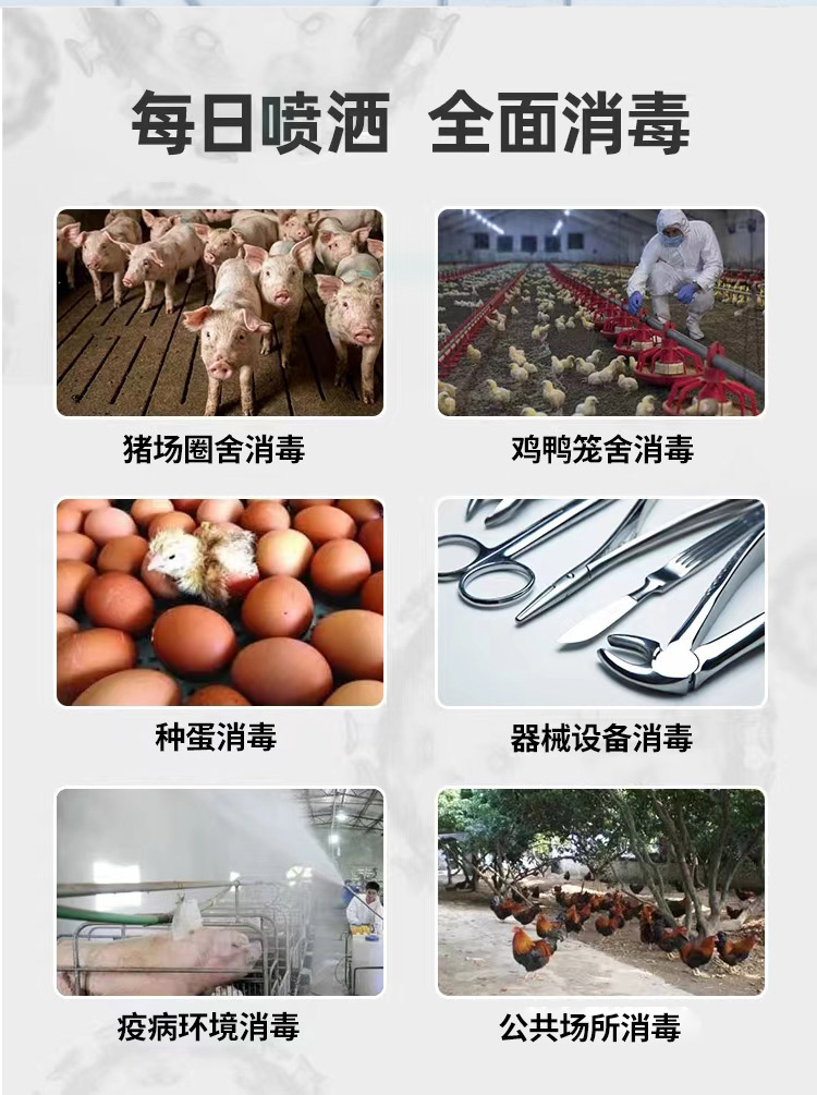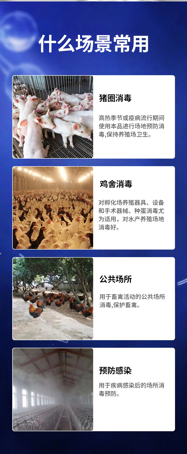2適用于家畜口蹄疫、藍耳病、烈性、溫和性豬瘟、圓環病毒、藍耳病、弓形體、附紅細胞體、鏈球菌、傳染性胃腸炎、流行性瀉痢及無名癥的傳染性高熱病等病毒性、細菌性疾病的消毒預防。