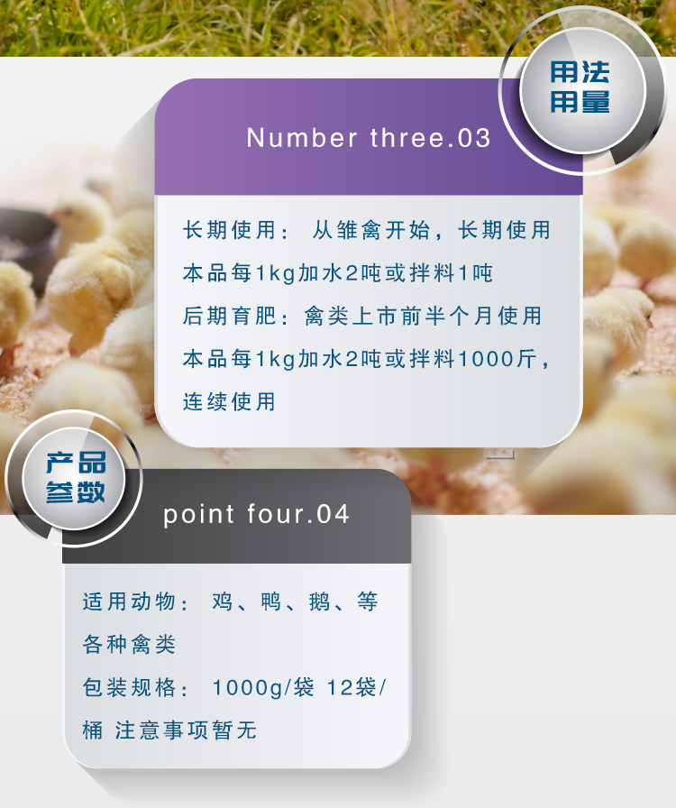 1.長期添加使用;從雛禽開始,長期持續使用,本品每1kg加水2噸或拌料一噸。
